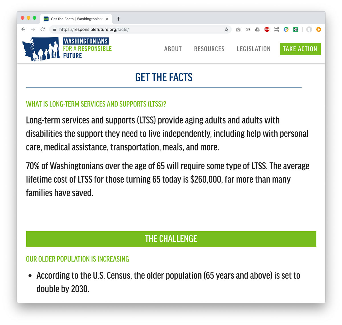 Washington state and the push for compassionate and responsible long-term care. Desktop and mobile UI and web design and development. Custom Google Map. Work with Summit Strategy